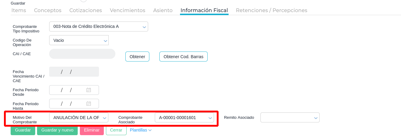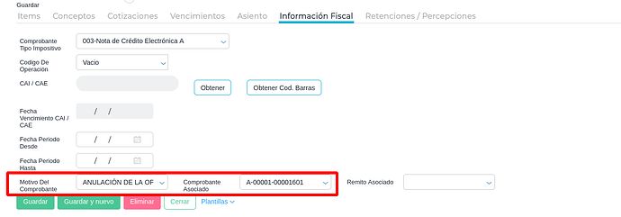 3-En la transacción, completar los campos “Motivos del comprobante” y “Comprobante asociado”: