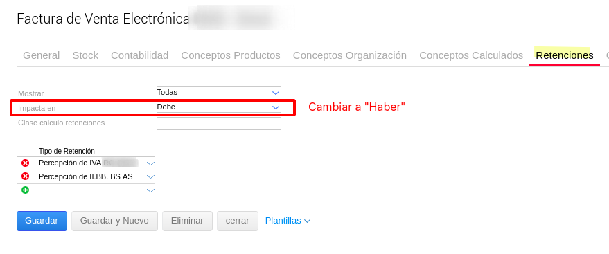 Ir a la solapa “Retenciones” y modificar el “Impacto” de manera que impacte en el Haber.