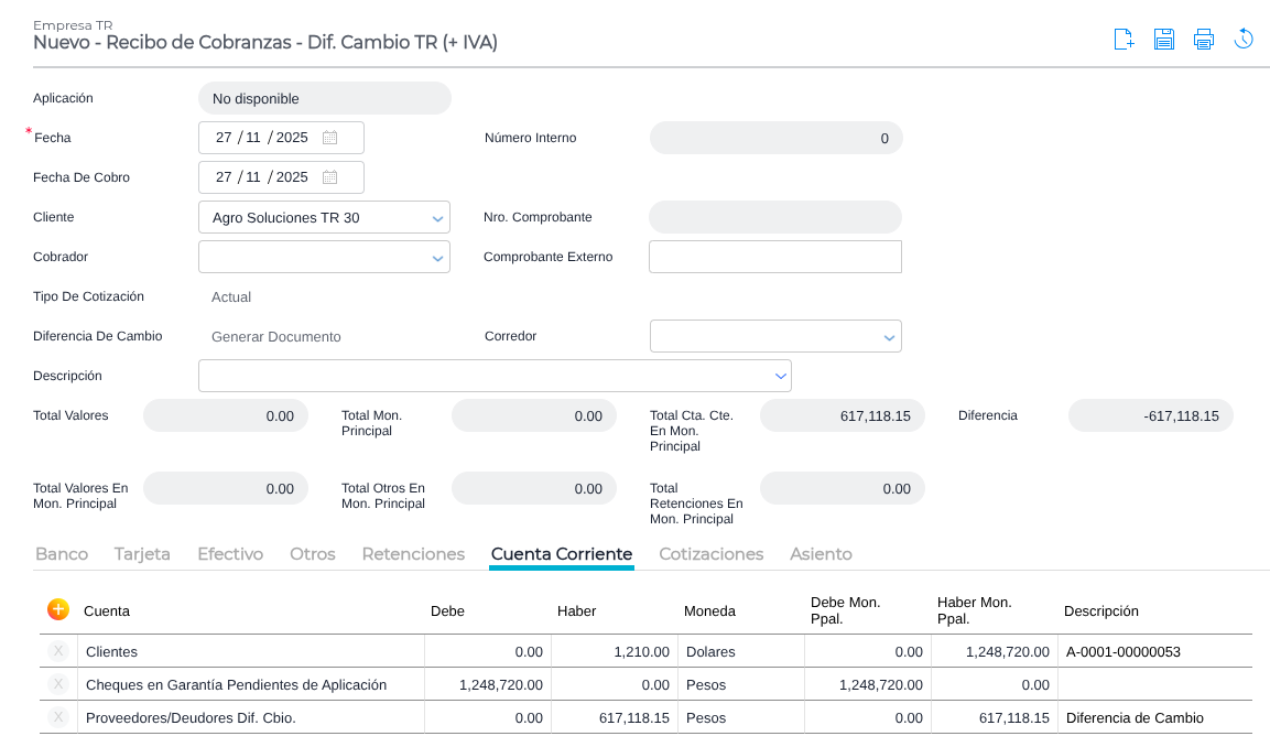 3) Registrar una segunda cobranza con asistente seleccionando las facturas de venta en dólares y los cheques en garantía. De esta manera, simulando una cobranza en cualquier fecha se puede calcular cuánto debe el cliente a la fecha actual; a su vez, si efectivamente llegó la fecha de vencimiento, se puede generar la diferencia de cambio desde allí mismo según el siguiente instructivo: