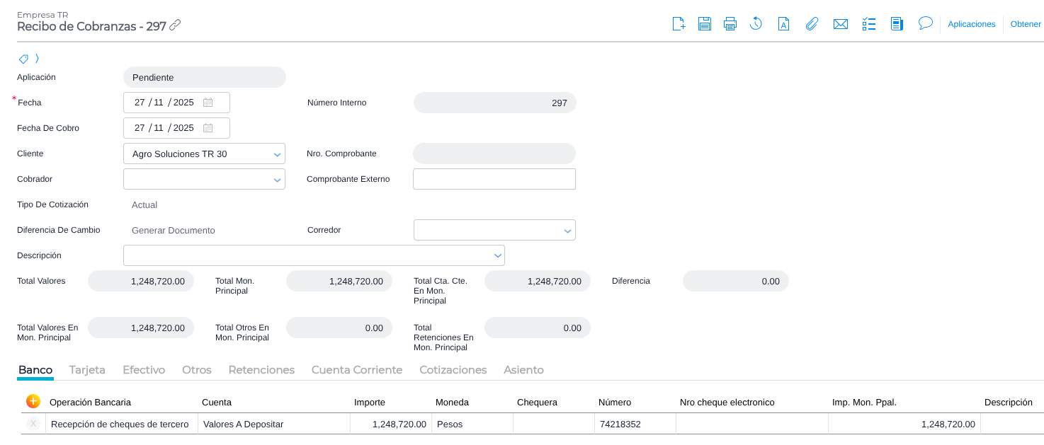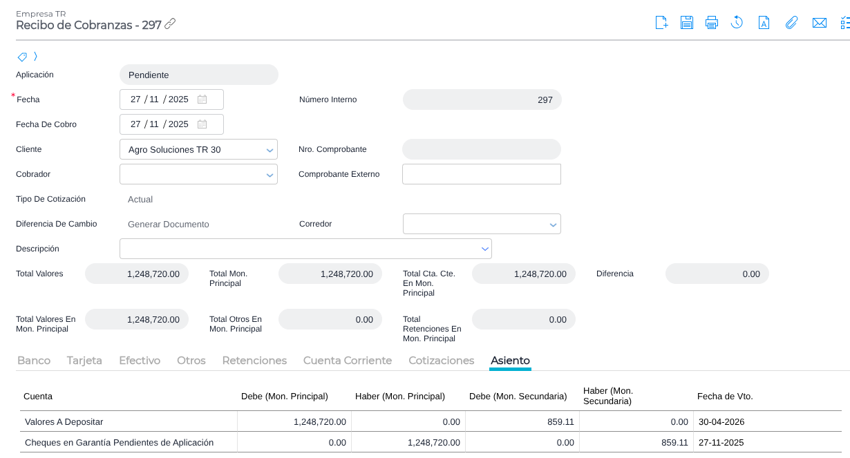 - Se registró una cobranza por un cheque por ARS 1.248.720 pendiente de aplicación