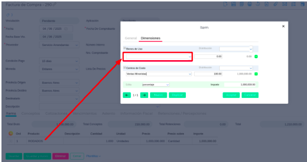 - El sistema filtra automáticamente y solo muestra facturas cuyos ítems tengan la dimensión “Bien de Uso” habilitada.