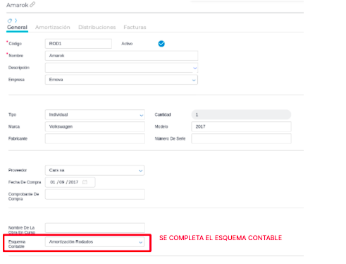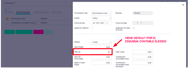 - Vida Útil: Al seleccionar el Esquema Contable , el sistema hereda el valor de vida útil configurado previamente en dicho esquema.