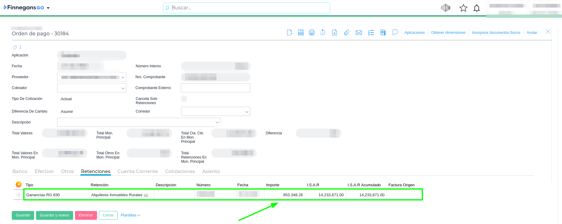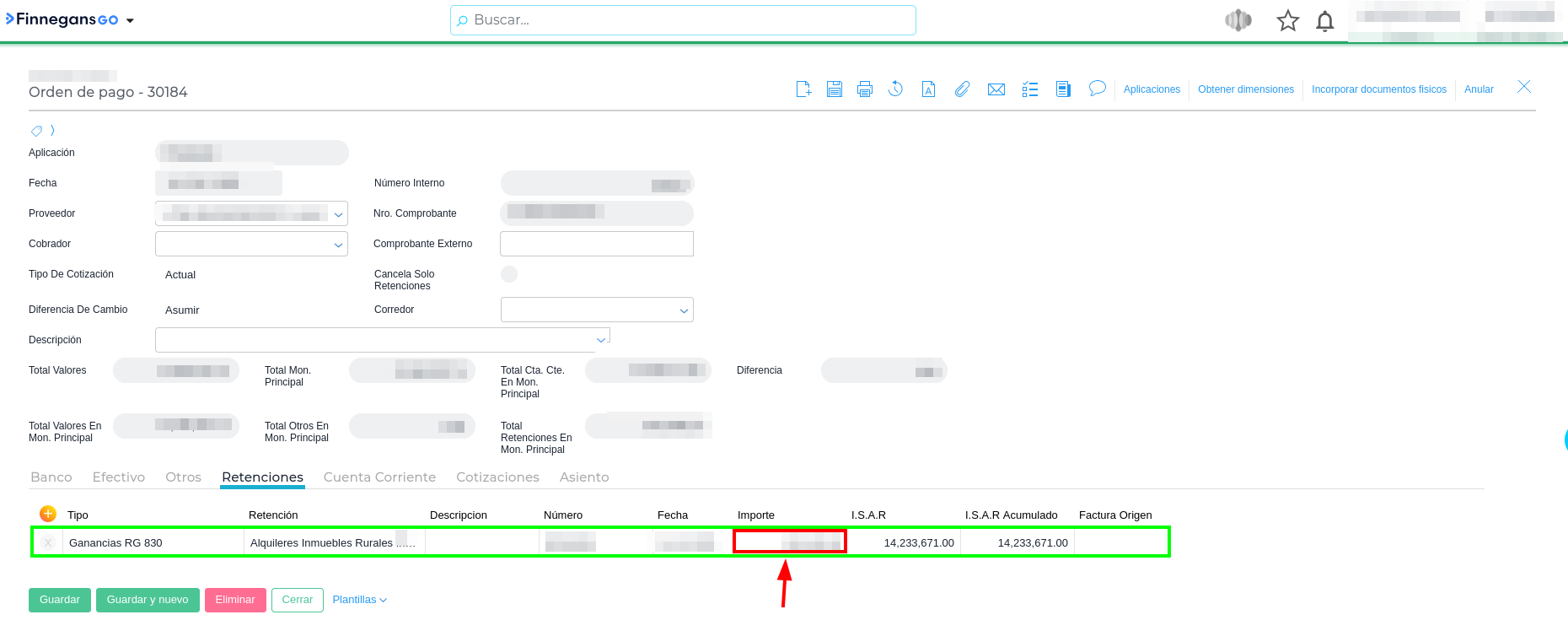 3 - Generar la Orden de Pago con Asistente y verificar que el sistema haya calculado correctamente la retención de Ganancias RG 830.