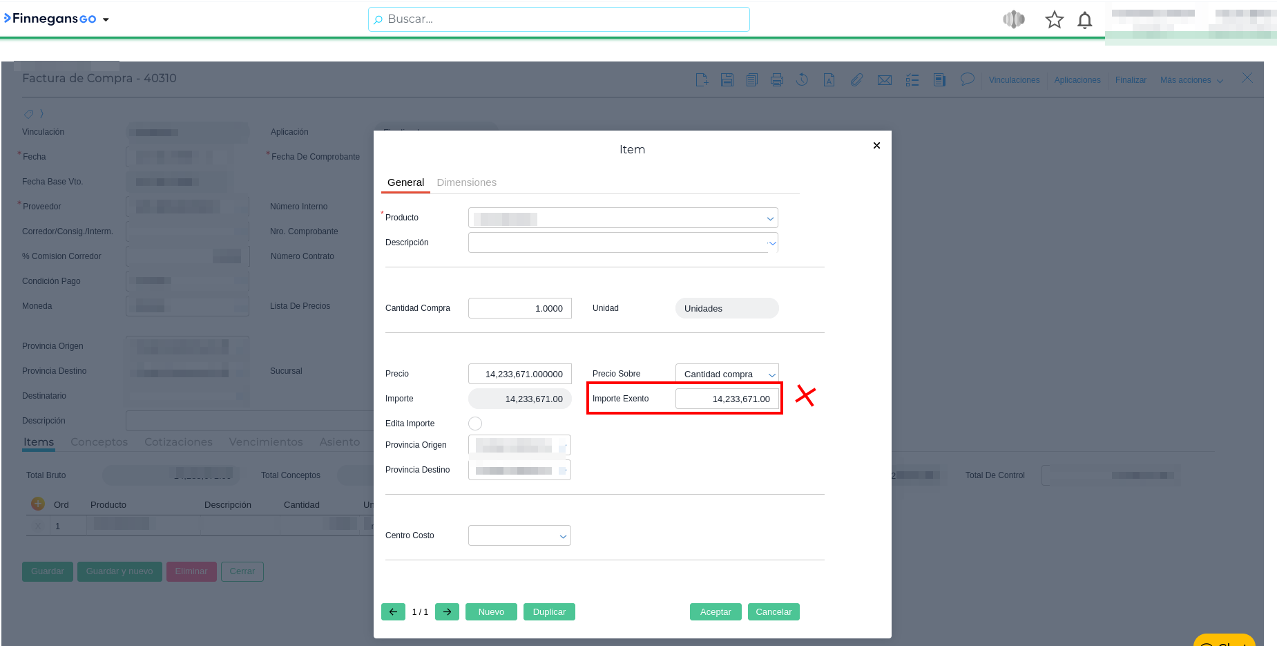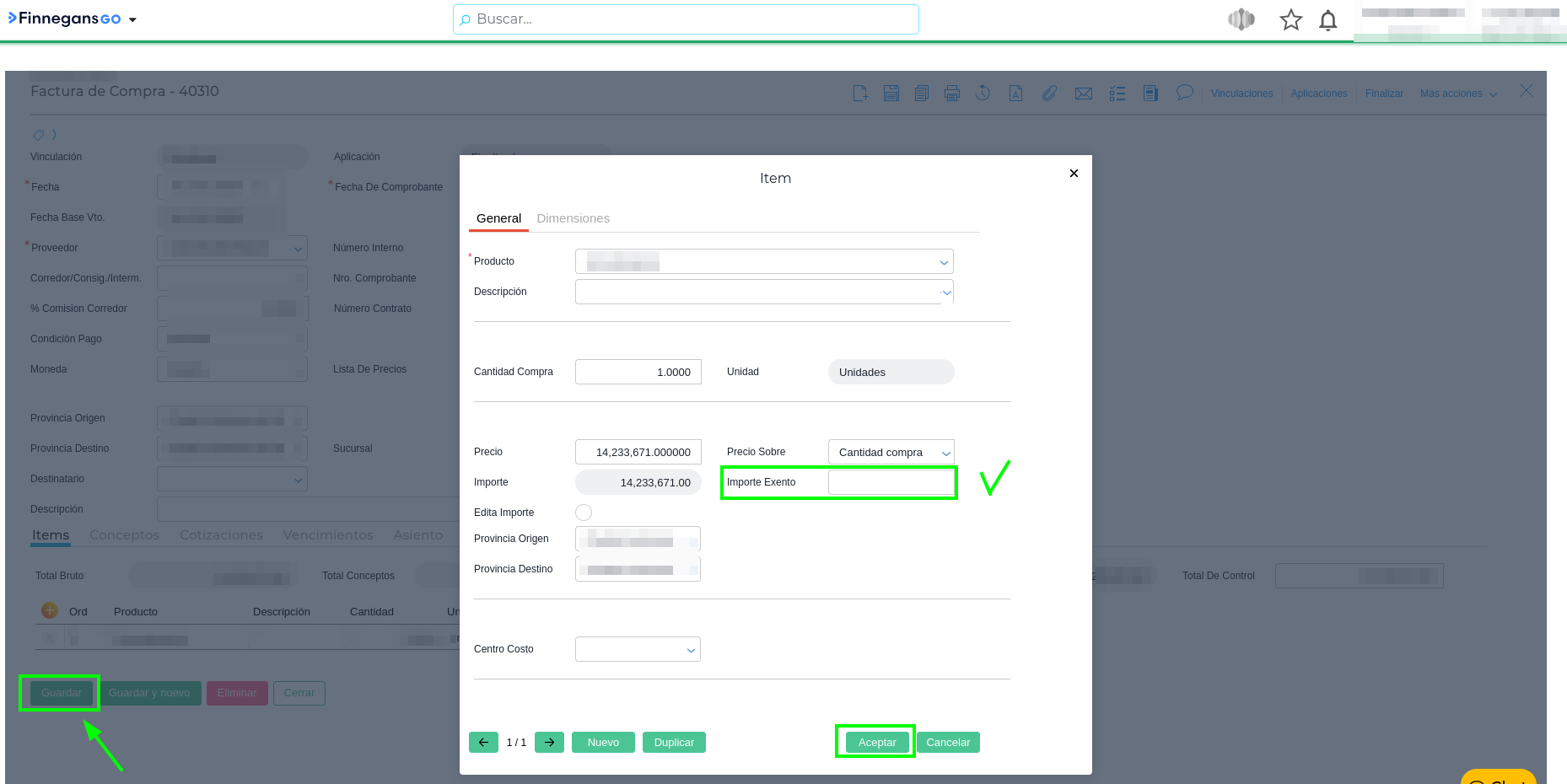 2 - Eliminar el importe que se encuentre cargado en el campo Importe Exento de la Factura de Compra y proceder a guardar nuevamente.