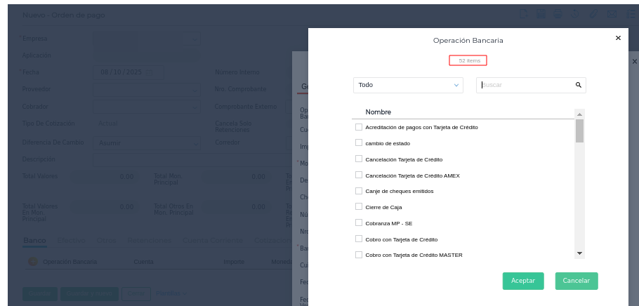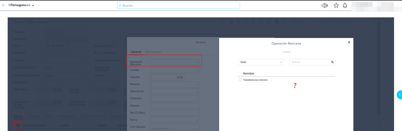 Al generar un documento ‘Orden de Pago’, el selector del campo ‘Operación Bancaria’ no muestra ningún tipo de operación, o muestra un listado incompleto. Este comportamiento afecta tanto a operaciones configuradas como públicas como a aquellas con privacidad definida.