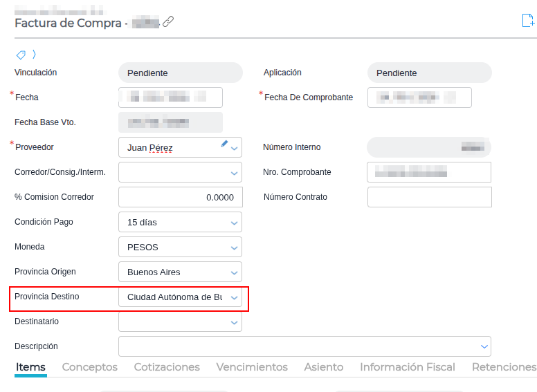 En este proceso, se verifica que el campo Provincia Destino de la Factura de Compra coincida con la provincia configurada en la retención. Por ejemplo, si la retención está definida para aplicarse únicamente cuando la provincia destino es Buenos Aires:
