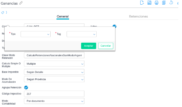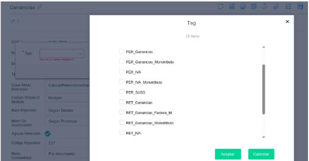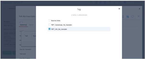 5)Una vez seleccionada una de las dos, el campo Tag muestra las opciones según corresponda (Retención/Percepción).