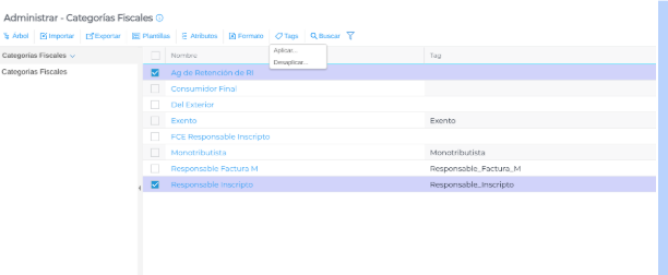 Allí se selecciona la categoría a la que se le va a indicar el tag, se presiona el botón Tags y luego la opción Aplicar…