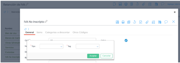En Tipo se selecciona la opción Retención y en Tag, RET_IVA_No_Inscripto.