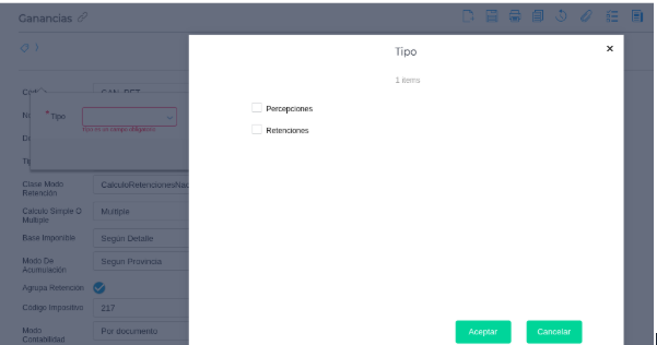 4)En Tipo, desplegar el selector y el sistema propone dos opciones: Retenciones y Percepciones.