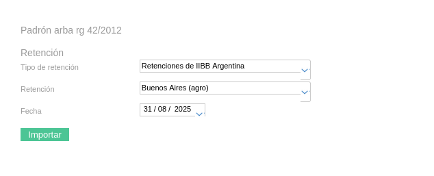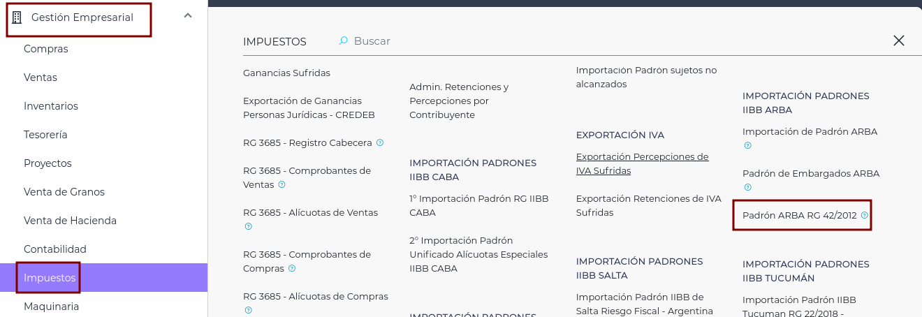 - Se debe ingresar el padrón de esta RG, desde Menú: Gestión Empresarial → Impuestos → Importación Padrones IIBB ARBA → Padrón ARBA RG 42/2012