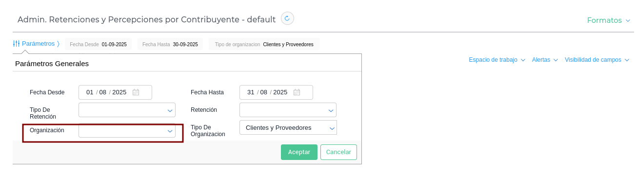 En el campo organización completamos con el proveedor que queremos ver específicamente y nos mostrará solo ese.