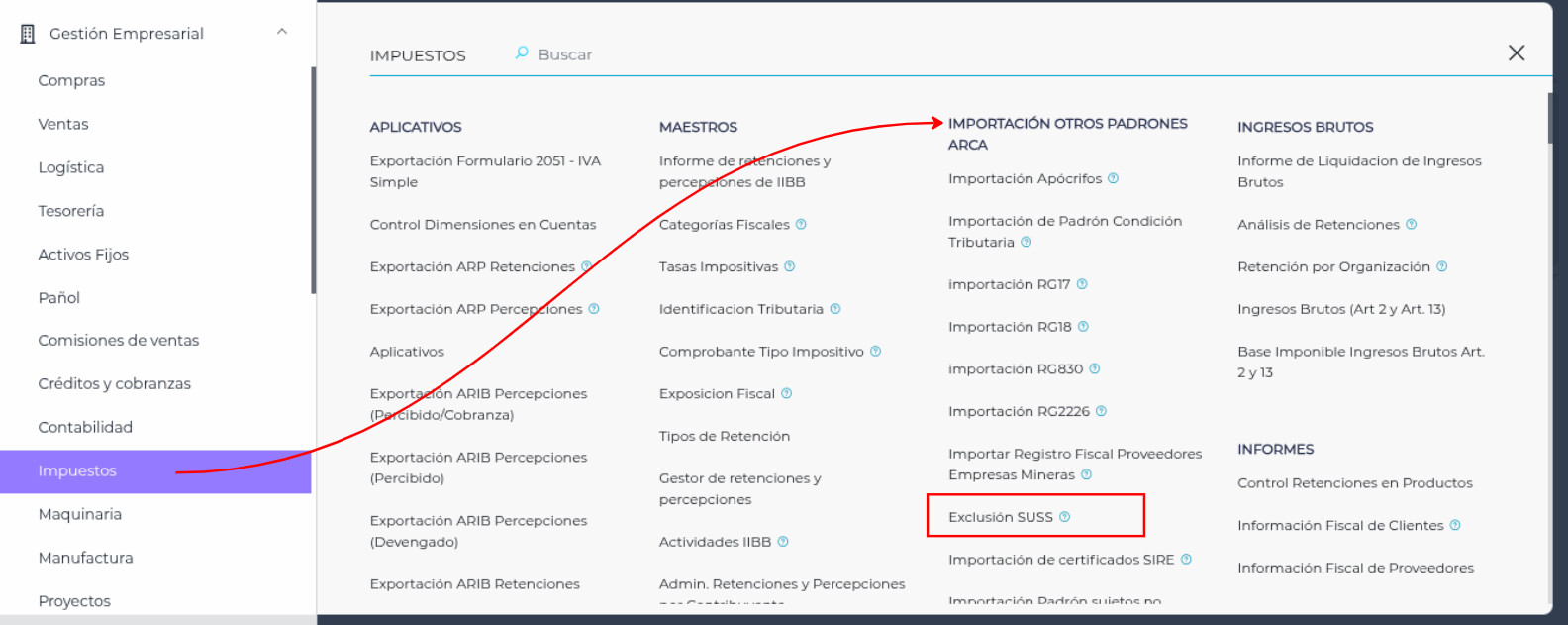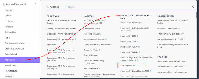 Ingresar desde Gestión Empresarial → Impuestos → Importacion otros Padrones ARCA - > Exclusión SUSS