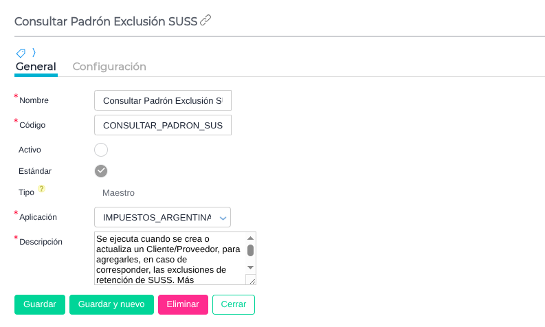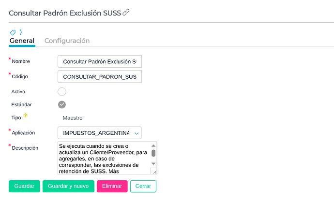 Bproc de cliente/proveedores: “Consultar Padrón Exclusión SUSS”, lo que hace es que cuando se edita un proveedor y lo guardas se ejecuta este padrón pero solo para ese proveedor, no para toda la nómina del padrón.