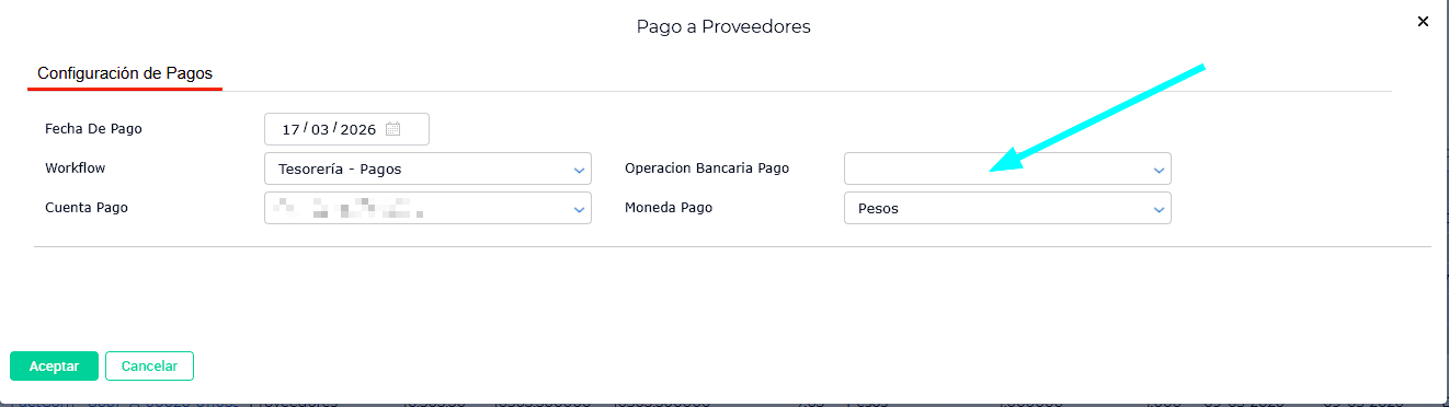 Selección de Cuenta de Pago: En el panel de “Configuración de Pagos”, seleccione la cuenta correspondiente al medio de pago que desea utilizar (por ejemplo, una cuenta de tipo “Tarjeta a pagar” o una cuenta bancaria específica).