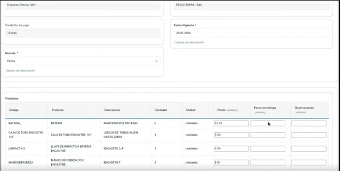 Fechas: El campo de fecha de entrega no es obligatorio. La fecha de vigencia no se comporta como un campo de tipo fecha estándar. -