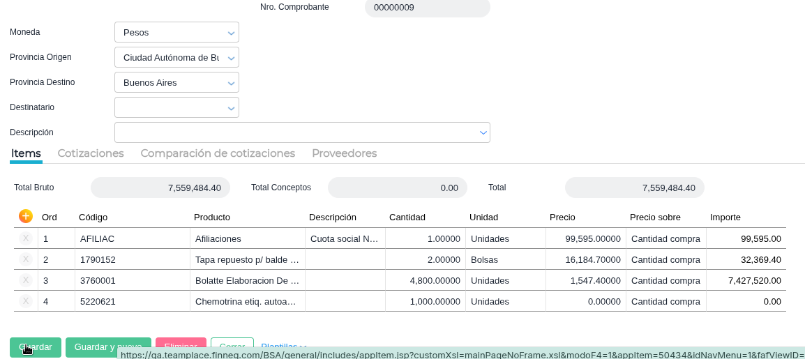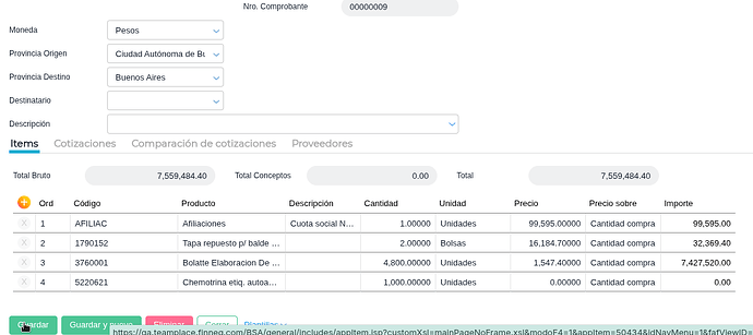 - En la columna editable “Cantidad a comprar” , ingrese la cantidad deseada para cada ítem. Validación : No se puede ingresar una cantidad mayor a la pendiente.
