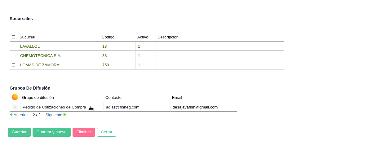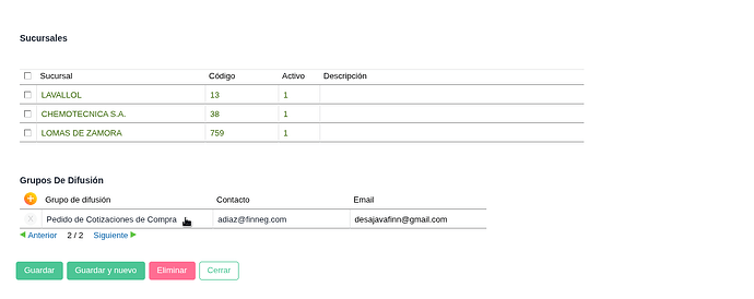 Si el documento tiene un “Grupo de Difusión” definido, el sistema enviará los correos a las direcciones configuradas para dicho grupo en la ficha del proveedor.