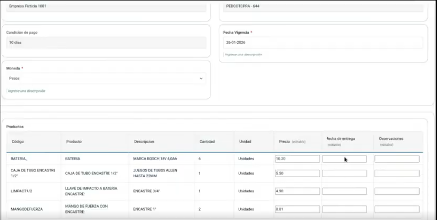 Información Heredada : El formulario mostrará el logo de la empresa, condiciones de pago por defecto del proveedor, fecha de vigencia y el listado de ítems con sus cantidades.