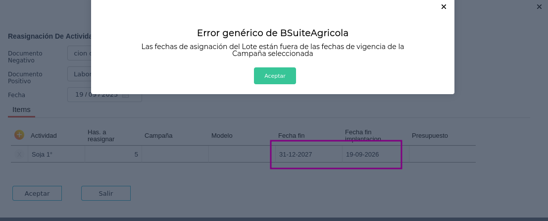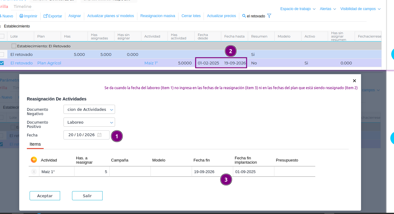 En planificación Agrícola como en Planificación Agrícola 2.0 el sistema puede reportar diferentes mensajes de error como lo pueden ser: “La fecha del laboreo debe estar comprendida entra las fechas del Lote y Actividad en los items de Distribución”, esto sucede porque la fecha del laboreo no ingresa en las fechas del plan anterior y tampoco en las fechas que se están utilizando para el nuevo plan, esto se soluciona cambiando la fecha del laboreo adentro de las fechas de la nueva reasignación o agrandando el rango de fechas de la nueva reasignación.