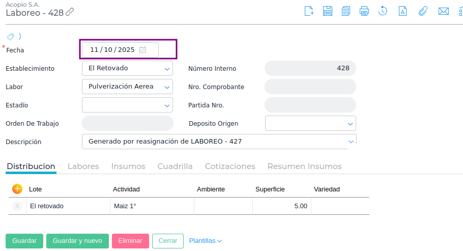 - Se deben reasignar los laboreos con fechas posteriores a los laboreos anteriores.