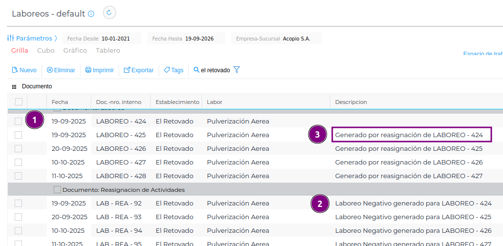 Al momento de reasignar, el sistema realiza un laboreo negativo para la actividad anterior y genera un nuevo laboreo, el cual tendrá la leyenda “Generado por reasignación de laboreo …”.