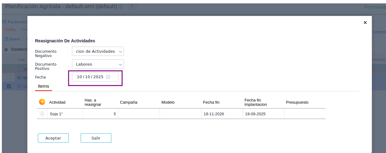 Reasignar actividades en Planificación Agrícola