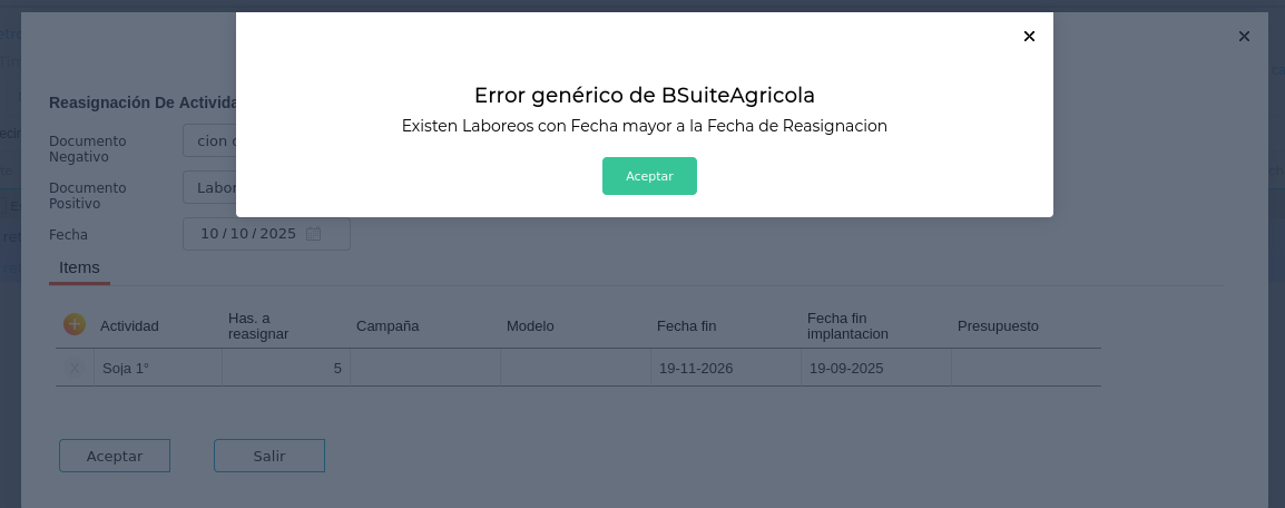 Otro error puede ser “Existen Laboreos con Fecha mayor a la Fecha de Reasignacion” esto significa que se quiere reasignar un laboreo que tecnicamente no se realizó, cronológicamente hablando.