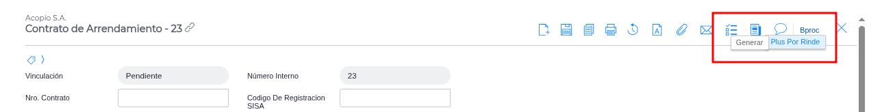 Al momento de querer crear un nuevo pago de Plus por Rinde, dentro del Contrato de Arrendamiento, seleccioná la opción BProc → Plus por Rinde → Generar:
