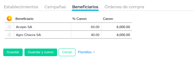 Por ejemplo, si se tienen dos beneficiarios, uno con 60% de participación y otro con 40%, si en los parámetros se ingresó cantidad 100 QQ, le corresponderá 60 QQ a uno y 40 QQ a otro: