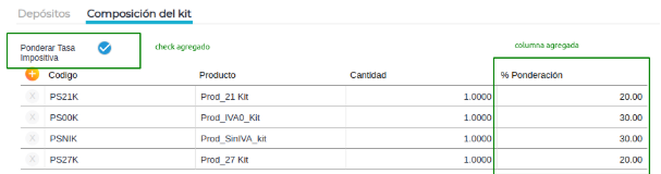 Columna “% de ponderación” Permite asignar qué porcentaje de la base de cálculo corresponde a cada tasa de IVA de los productos que integran el kit.