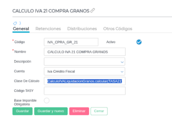 Pantalla “CÁLCULO IVA 21 COMPRA GRANOS” mostrando la Clase de Cálculo con TASA21.