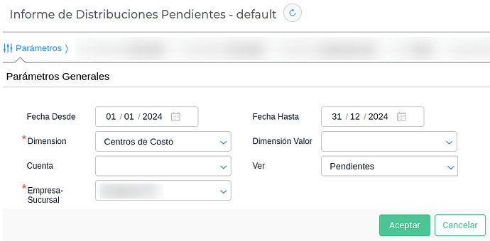 Distribuir todos los pendientes para la dimensión Centro de Costos desde el informe de Distribuciones Pendientes. En el mismo se podrá filtrar por Fecha Desde, Fecha Hasta, Dimensión, Empresa-Sucursal y Ver Pendientes como se indica a continuación: