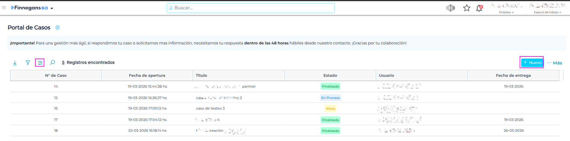 - Columnas Informativas: Muestran datos clave como el Nº de Caso, Fecha de Apertura, Título, el Estado Actual y Fecha de cierre.