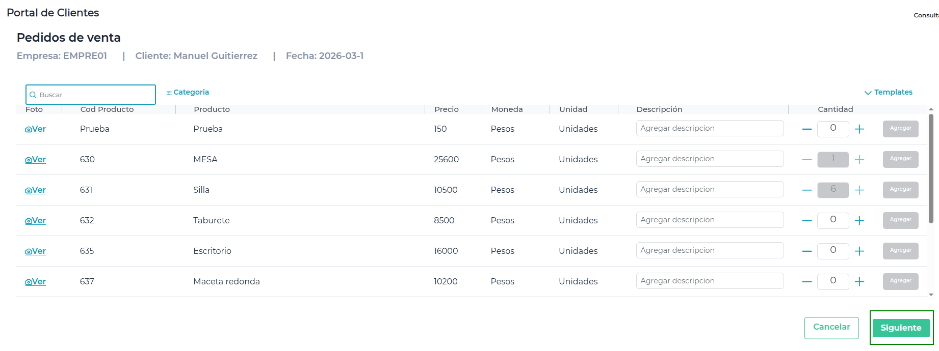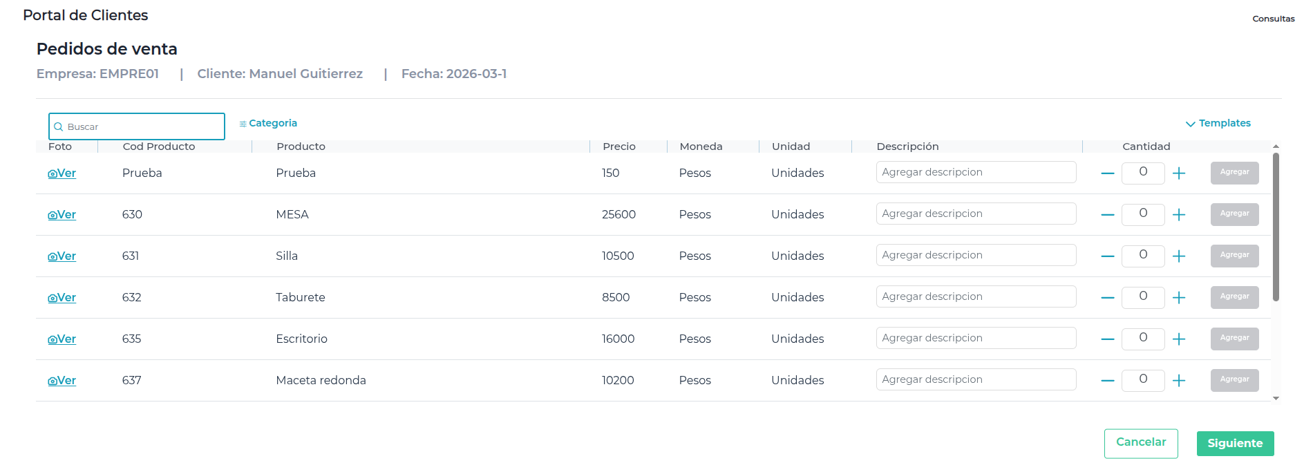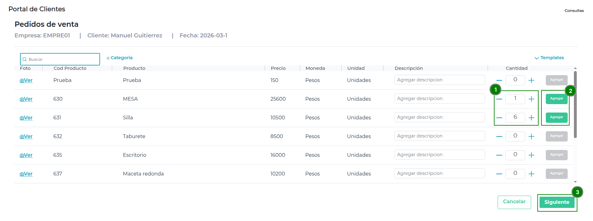 - Podrá agregar productos al pedido siempre que la cantidad sea mayor a 0. Solo en ese caso se habilitará el botón Agregar para incluirlo en el mismo.