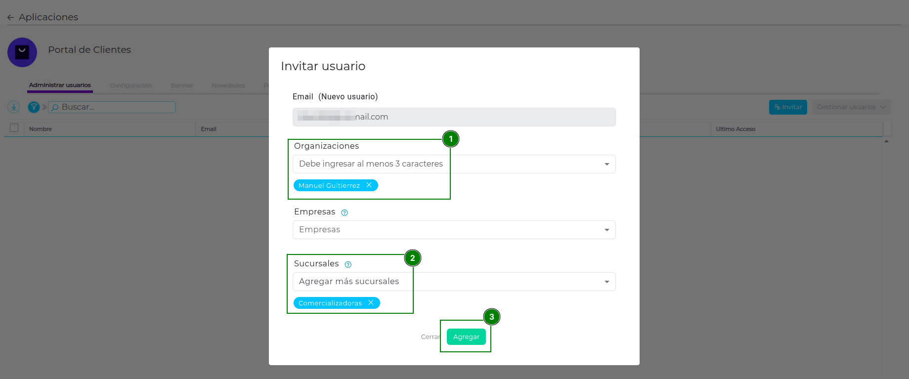 Al mail se le debe asociar un organización, en este caso, deberá ser un cliente, el cual esta previamente registrado en el Maestro de Clientes del ERP. Cambien se le deberá asociar la sucursal en la cual podrá ingresar el usuario invitado_