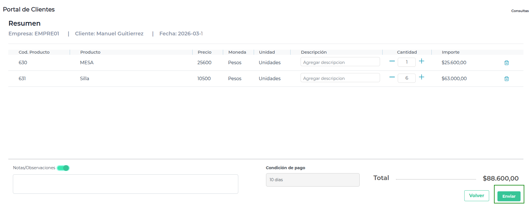 - Podrá agregar Notas/Observaciones al pedido habilitando el check.