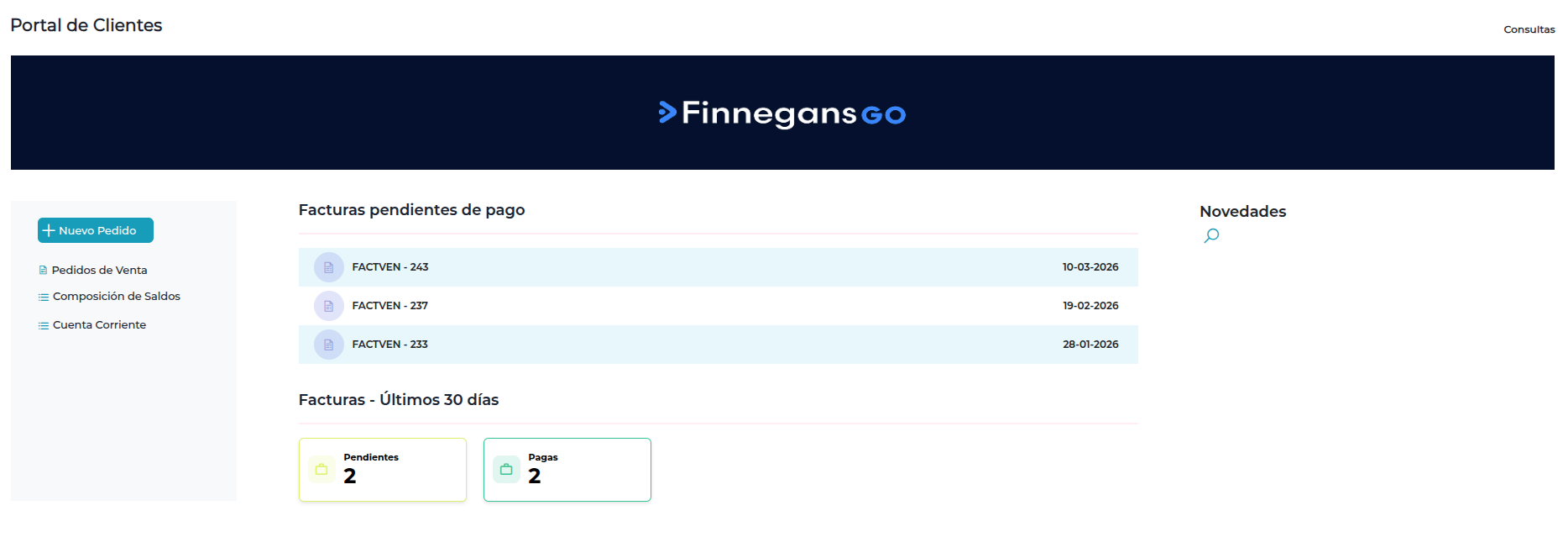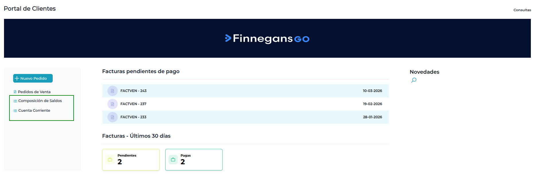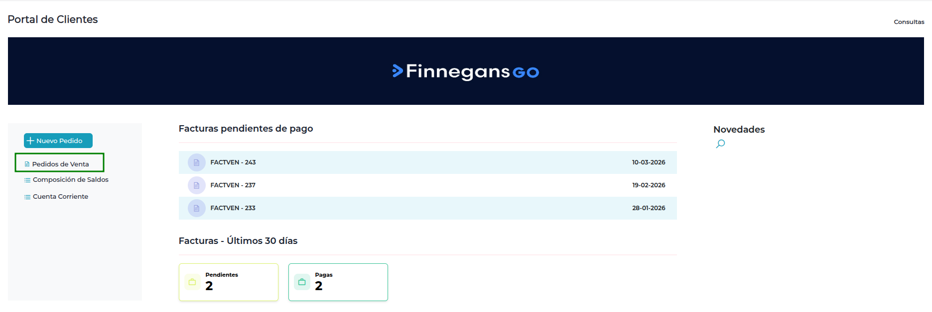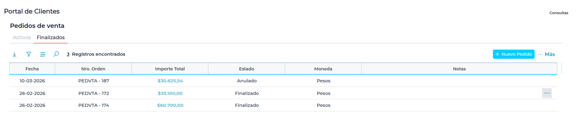 Pedidos de Venta: podrá acceder al detalle de Pedidos de Venta Activos y Finalizados.