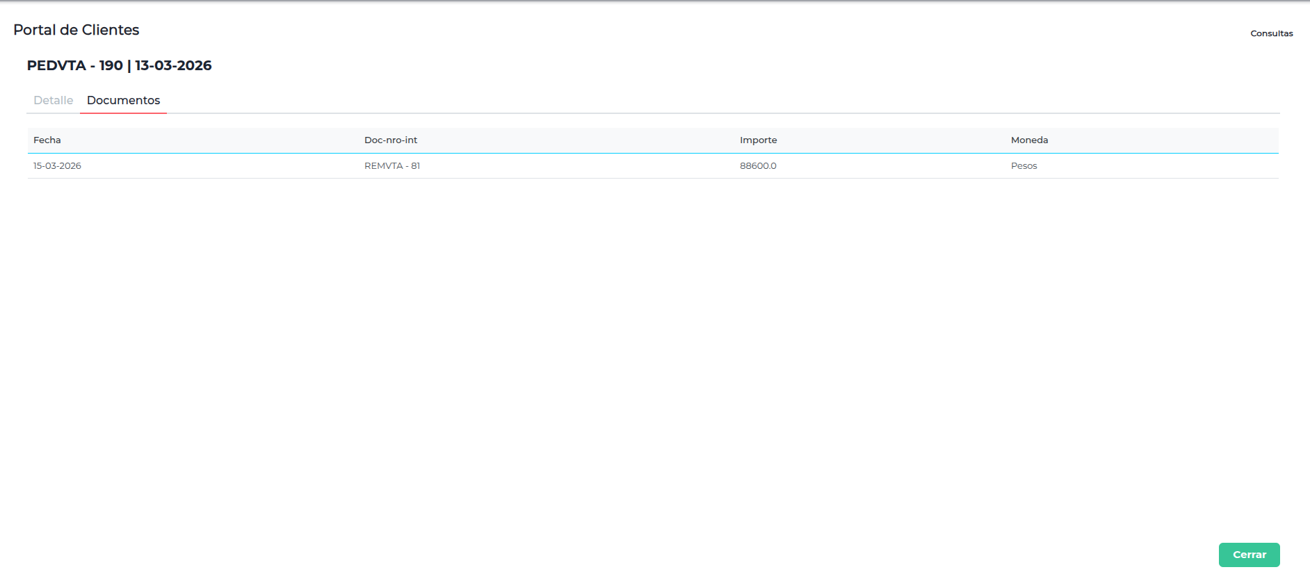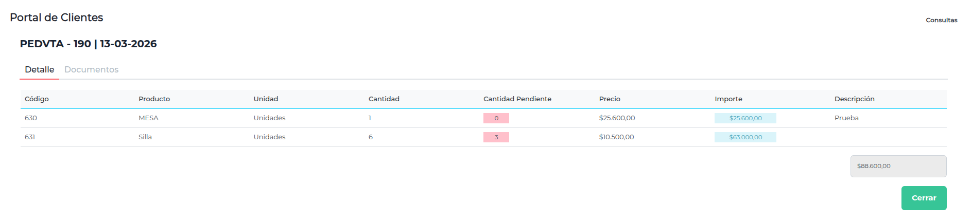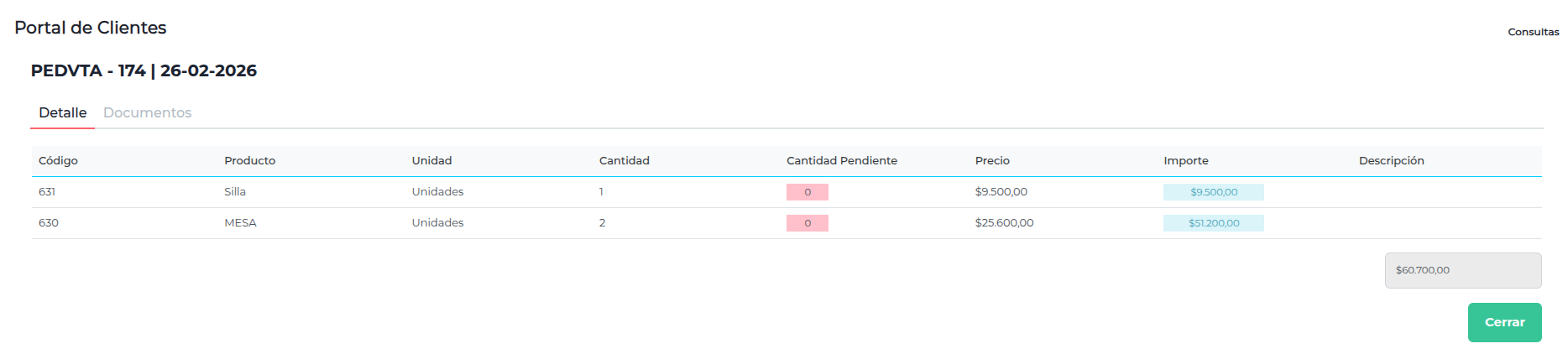 Al hacer clic sobre el registro del pedido podrá ver el detalle del mismo: