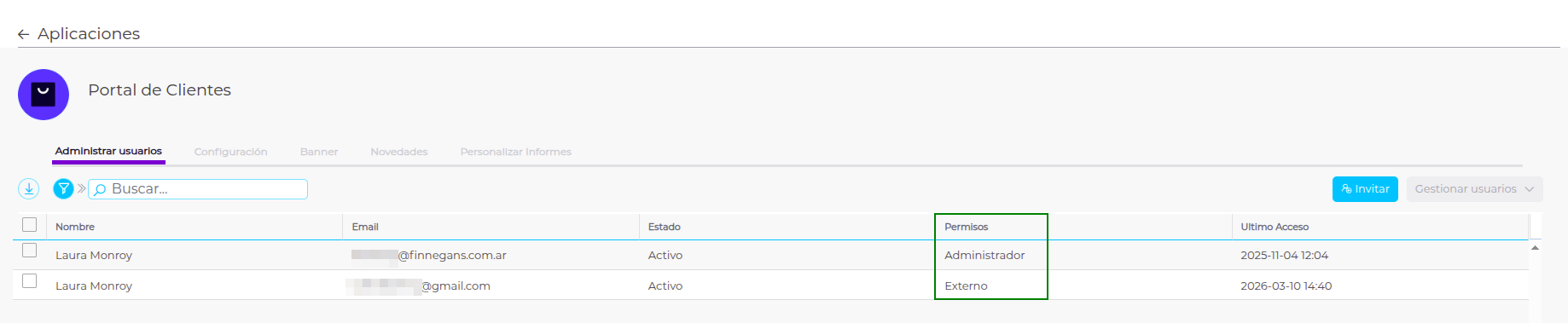 Desde Menú → Administrar → Plug&Go → Instaladas → Portal de Clientes → Administrar → Administrar usuarios