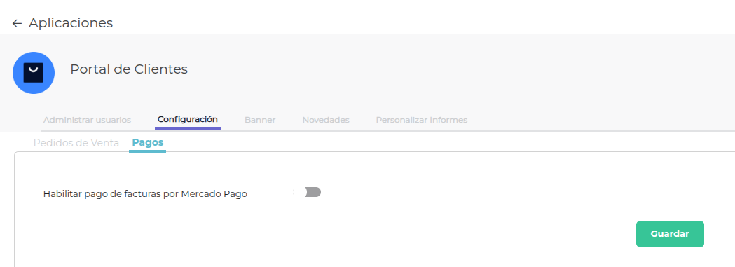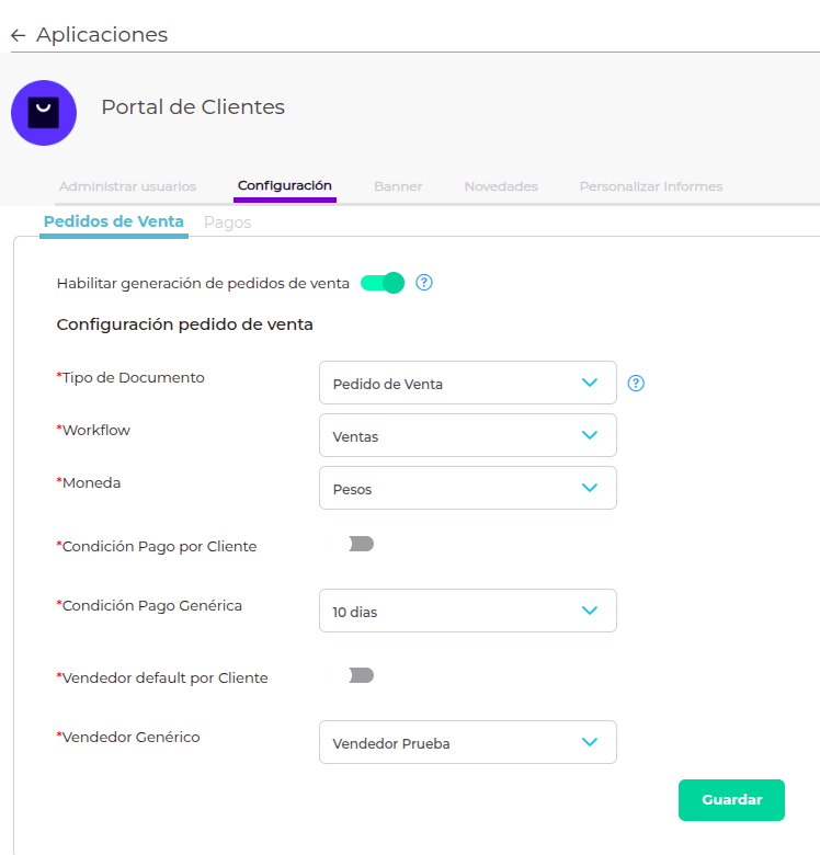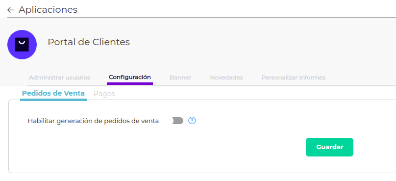 En caso de no necesitar que los clientes generen pedidos de venta desde la aplicación, se debe apagar el botón que se visualiza en pantalla y presionar “Guardar”: