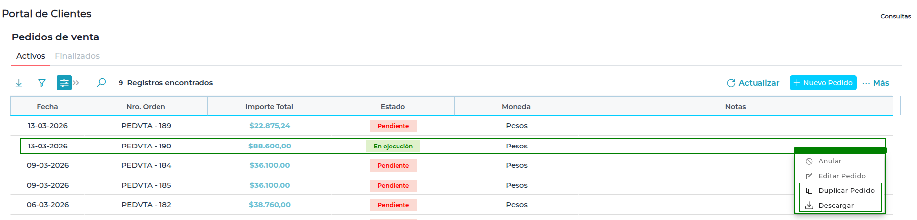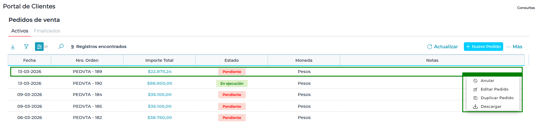 - Pendiente: Anular, Editar, Duplicar y Descargar.