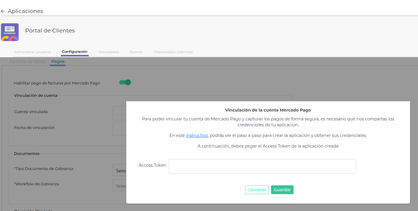Cuando se enciende el botón, se visualiza la sigueinte ventana emergente donde se solicita ingresar el Token de la cuenta de Merccado Pago: