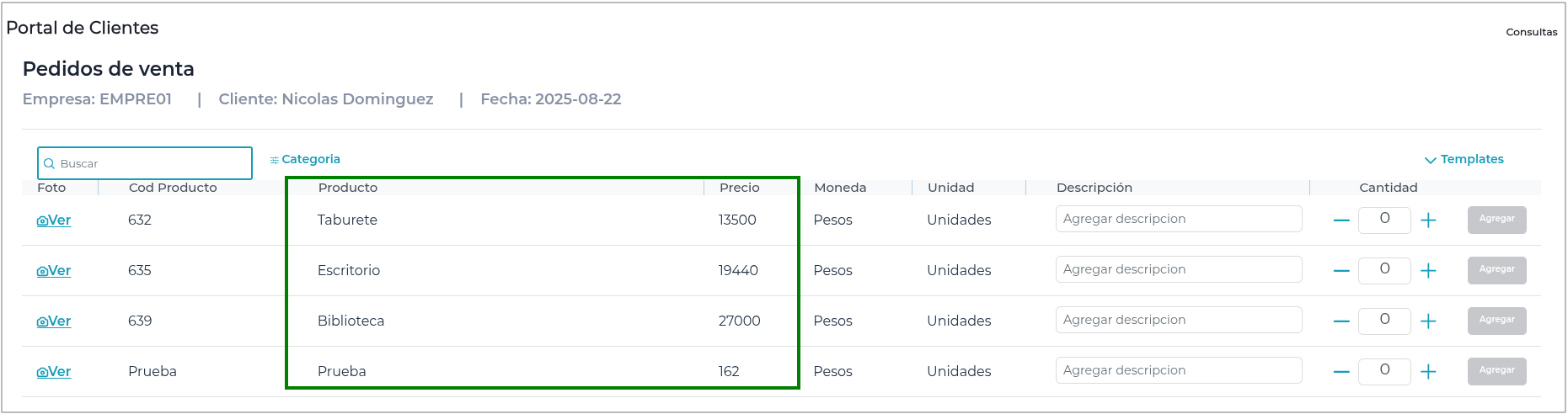 En el Portal de Clientes, al ingresar en “Nuevo Pedido” se mostrarán los productos y precios que están definidos en la lista de asociada al cliente, así se podrán seleccionar los productos y cantidades que serán agregados al Pedido de Venta.