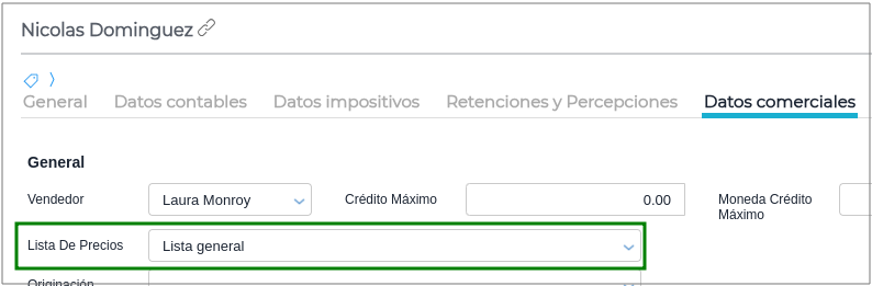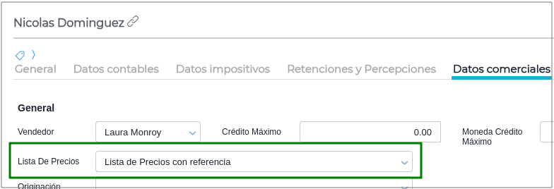 A continuación se presenta un ejemplo del comportamiento. Se configura un Cliente al cual se le asigna una Lista de Precios que a su vez tiene asociada una Lista de referencia: