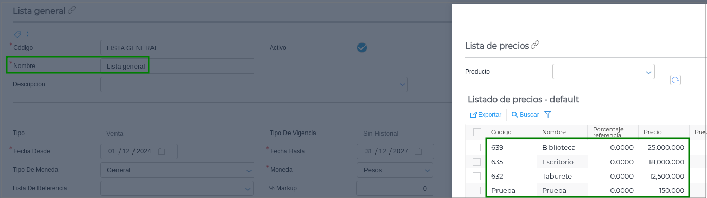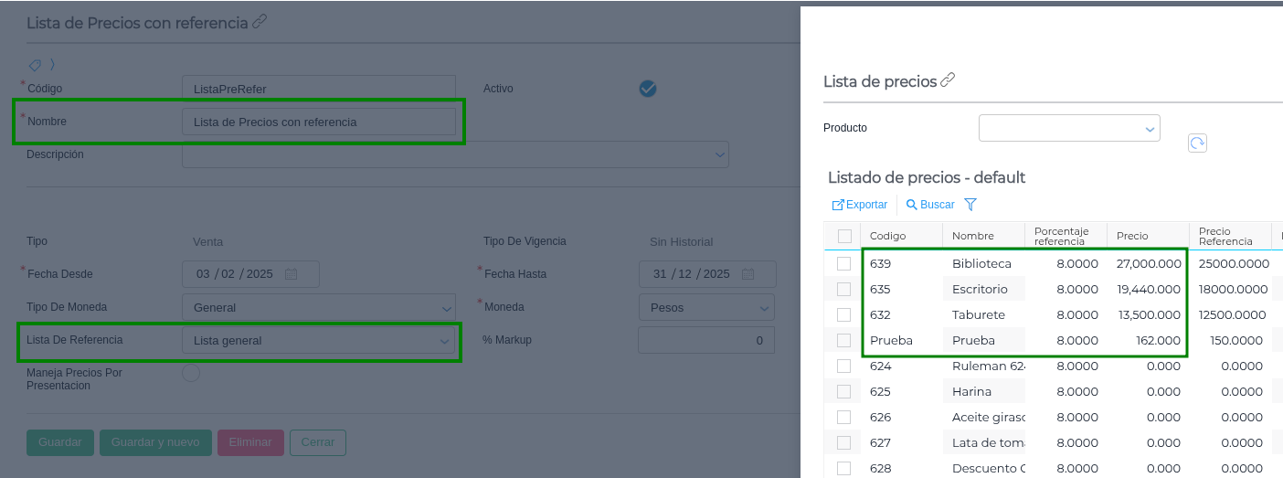 - Lista de Precios, con una de referencia asociada, donde se aplica un porcentaje de referencia sobre el precio: