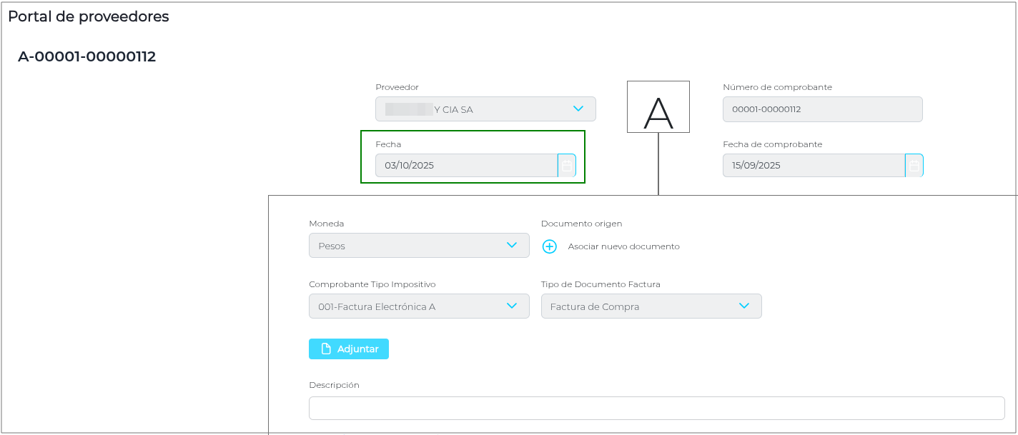 En los documentos de compra cargados desde el Portal de Proveedores, el campo “Fecha” se completa automáticamente con la fecha del día en que se registra la Factura de Compra, no puede ser modificado por el proveedor y se muestra en gris para indicar que está bloqueado. De esta manera, se garantiza que la fecha registrada coincida siempre con la fecha de carga del documento.