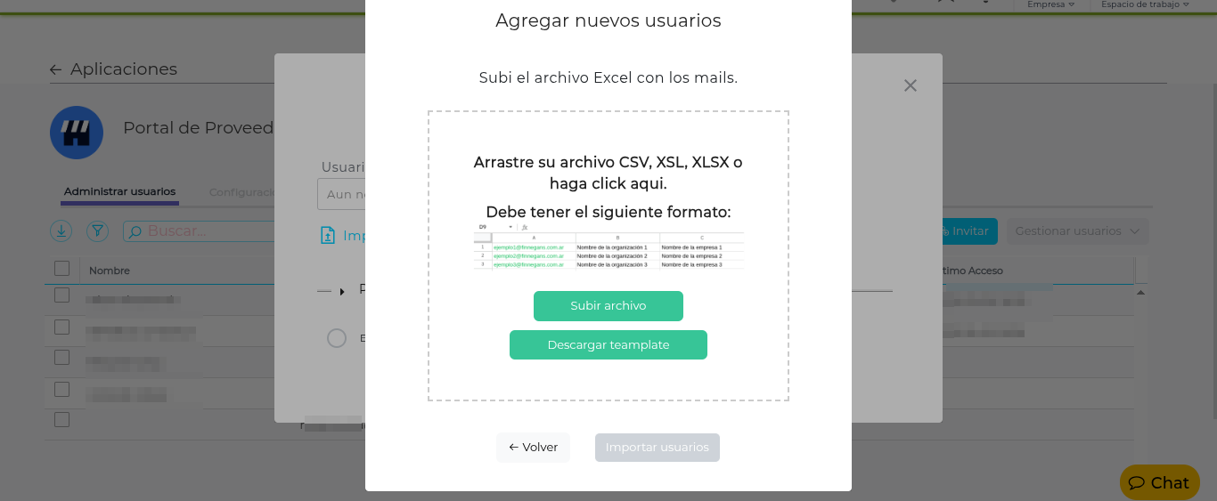 4- En el popup que se abre podemos descargar el template para completarlo, y luego esta el botón para importar el archivo con la lista de usuarios