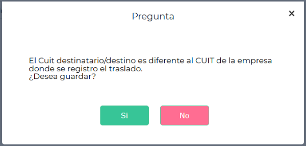 El sistema detecta una inconsistencia de identidad legal: nos indica que la empresa donde estamos logueados (posicionados) tiene un CUIT diferente al que se está declarando en el campo de Destino o Destinatario.