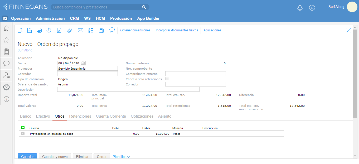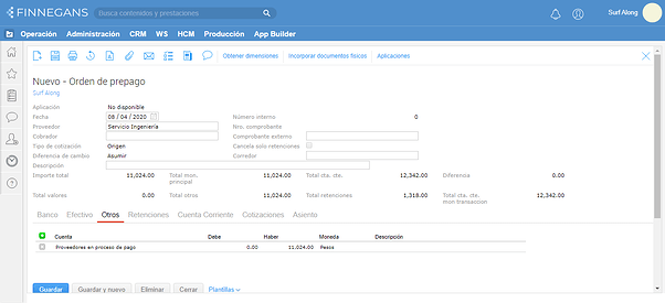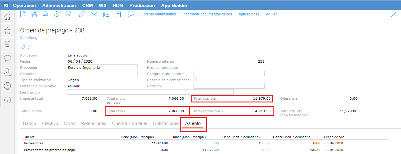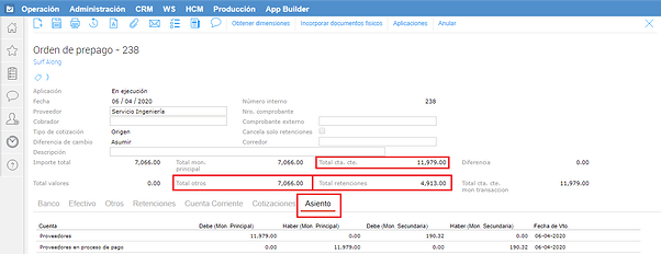 Aquí podemos visualizar previo a guardar la orden de prepago el monto que le retendremos al proveedor y el que le vamos a abonar.